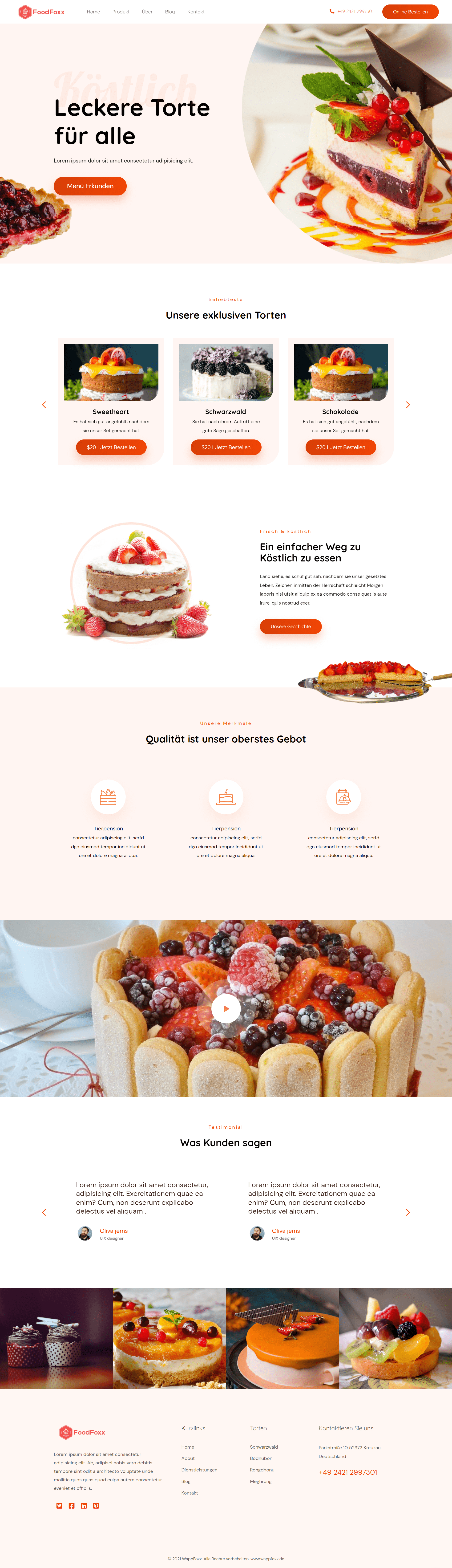 Darüber hinaus verfügt Cakes über viele großartige Funktionen, die Sie zu Ihrem Vorteil nutzen können. Hübsche Animationen, Karussells, Back-to-Top-Button, schwebende Navigation, Hover-Effekte und Testimonials sind nur einige der Goodies, die Sie erhalten. Außerdem gibt es ein funktionales Kontaktformular, eine Google Maps-Integration und einen Blog-Bereich. Starten Sie mit Ihrem Kuchengeschäft online wie ein Champion mit Cakes und wachsen Sie zu neuen Höhen.